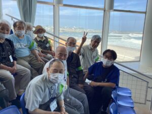 千波館 長者ヶ谷津温泉館 pickup外出レク合同企画 毎年恒例の大洗アクアワールド♪ 2025年7月15日 2025年7月15日 長者ヶ谷津温泉館と合同で、大洗アクアワールドに行ってきました。 圧巻のイルカのショーを楽しみました! 「芸を習得するのには、時間がかかるわよね。」 「イルカかわいいねぇ。」 イルカが跳ねるたび、水しぶきが上がり、とっても涼やかです。 マンボウやサメのいる大水槽もじっくり眺めました。 最後に集合写真をパチリ。 台風が接近し、生憎のお天気でしたが、帰りには虹を見ることができました🌈 次回の外出レクもお楽しみに♪