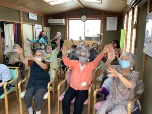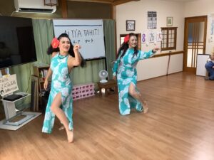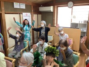 千波館 pickupボランティア タヒチアンダンス♪ 2025年9月9日 2025年9月9日 先日、ボランティアの先生をお招きして、タヒチアンダンスを楽しみました。 テンポの速い音楽と、先生や子供たちの素敵なダンス♪ 「衣装がとってもきれい!」「手先まで動きがしなやかねぇ。」 ご利用者様も楽しくなって、みんなで踊ってます。 皆さんうっとりと、楽しい時間を過ごしました♪